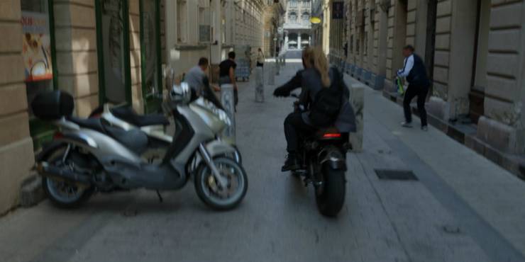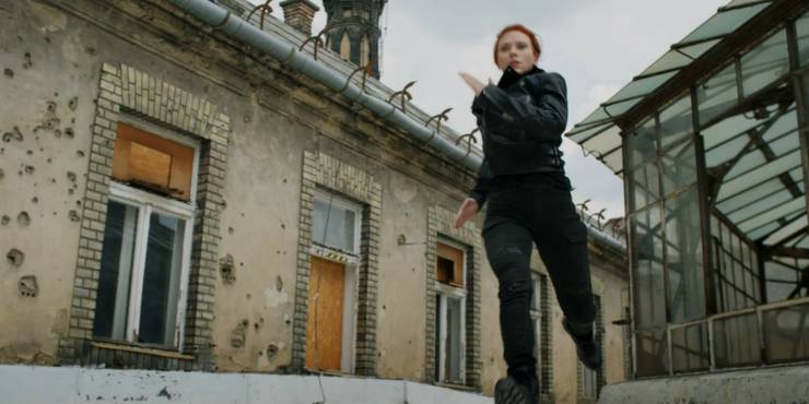 Ngay sau đó là một chuỗi hành động mạnh diễn ra trên mái nhà, với không chỉ hai mà ba Black Widow – người thứ ba khó nhìn rõ, nhưng có vẻ đó là Melina của Rachel Weisz. Các cô gái rượt đuổi trên mái nhà và dùng một ống khói để xuống mặt đất. Chú ý rằng Yelena Belova và Natasha Romanoff mặc trang phục giống hệt cảnh trước, nên có thể cảnh này diễn ra ngay sau. Yelena cố giữ chiếc balo, dù việc đó khiến cô ta khó giữ thăng bằng khi trèo xuống ống khói.